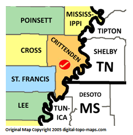 | current | ★ Approved revision 09:55, 11 May 2018 | 274 × 279 (38 KB) | Bethcottam (talk | contribs) | Map courtesy of [https://www.digital-topo-maps.com/county-map/arkansas.shtml]. Copyright 2005.<br> Category:Arkansas Maps Category:Crittenden County, Arkansas |