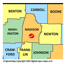 | current | ★ Approved revision 18:35, 24 May 2018 | 278 × 269 (40 KB) | Bethcottam (talk | contribs) | Map courtesy of [https://www.digital-topo-maps.com/county-map/arkansas.shtml]. Copyright 2005.<br> Category:Arkansas Maps Category:Madison County, Arkansas |