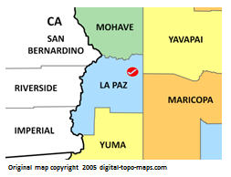 | current | ★ Approved revision 21:20, 4 September 2018 | 253 × 194 (19 KB) | Bethcottam (talk | contribs) | Map courtesy of [https://www.digital-topo-maps.com/county-map/arizona.shtml]. Copyright 2005.<br> Category:Arizona Maps Category:La Paz County, Arizona |