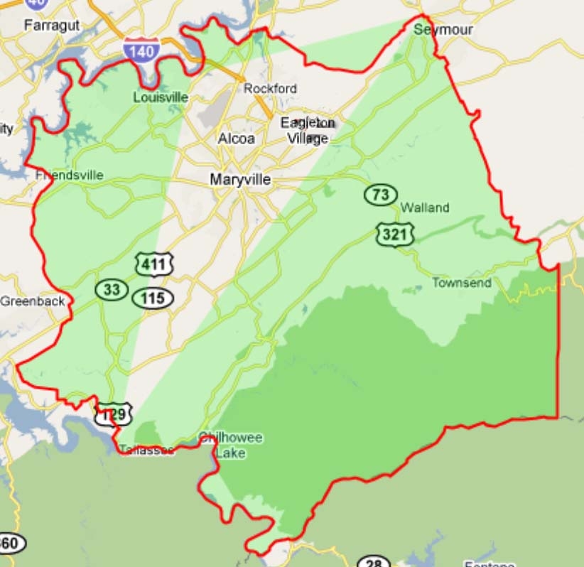 TITLE: Blount County Boundary Map DATE: RIGHTS STATUS: Has the right to distribute DESCRIPTION: http://maps.huge.info/county.htm. Used with permission of John Coryat, USNaviguide LLC WIKI: FamilySearch Wiki
