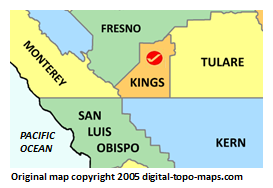 | current | ★ Approved revision 09:38, 12 June 2018 | 273 × 188 (23 KB) | Bethcottam (talk | contribs) | Map courtesy of [https://www.digital-topo-maps.com/county-map/california.shtml]. Copyright 2005.<br> Category:California Maps Category:Kings County, California |