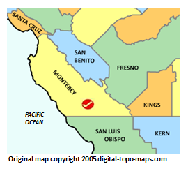 | current | ★ Approved revision 16:21, 12 June 2018 | 270 × 245 (31 KB) | Bethcottam (talk | contribs) | Map courtesy of [https://www.digital-topo-maps.com/county-map/california.shtml]. Copyright 2005.<br> Category:California Maps Category:Monterey County, California |