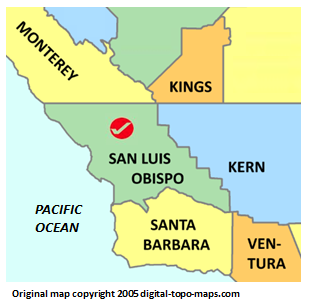 | current | ★ Approved revision 08:32, 14 June 2018 | 309 × 305 (40 KB) | Bethcottam (talk | contribs) | Map courtesy of [https://www.digital-topo-maps.com/county-map/california.shtml]. Copyright 2005.<br> Category:California Maps Category:San Luis Obispo County, California |