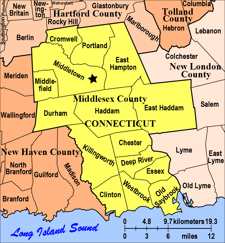 English: Map of modern city and town borders in Middlesex County, Connecticut. |