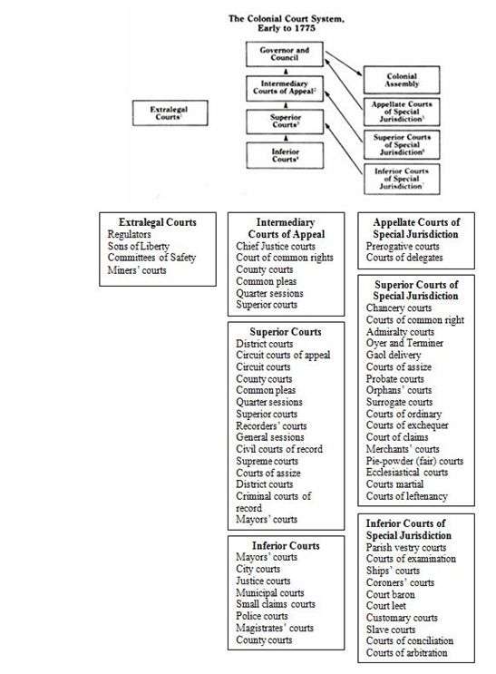 Description:The Colonial Court System. Early to 1775, United States. Permission: The International Institute of Genealogical Studies gave permission for this image to be used in the FamilySearch Wiki, 20 November 2012. Source: The International Institute of Genealogical Studies.