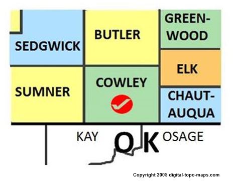 | current | ★ Approved revision 09:11, 13 September 2017 | 464 × 368 (31 KB) | Amberannelarsen (talk | contribs) | Map courtesy of [https://www.digital-topo-maps.com/county-map/kansas.shtml/ Digital-Topo-Maps.com]. Copyright 2005. Category:Kansas Maps Category: Cowley County, Kansas |