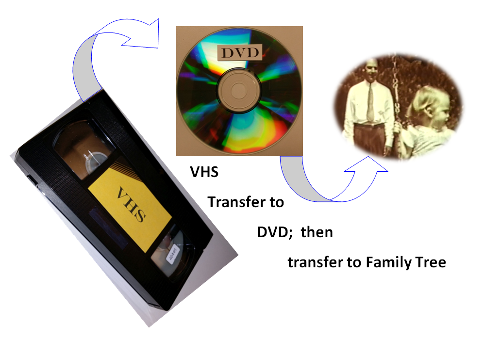Composite showing transfer of VHS to DVD and then transfer of picture from DVD to Family Tree. Picture shows my deceased father swinging me on a swing in the backyard.