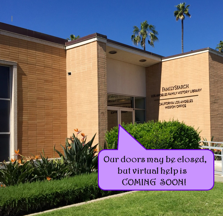 Library Announcement - Virtual family history help coming soon to LA patrons even though library doors are closed due to Covid-19.