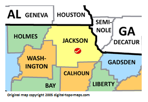| current | ★ Approved revision 21:03, 7 September 2018 | 305 × 210 (35 KB) | Bethcottam (talk | contribs) | Map courtesy of [https://www.digital-topo-maps.com/county-map/florida.shtml]. Copyright 2005.<br> Category:Florida Maps Category:Jackson County, Florida |