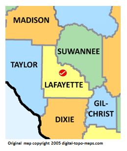 | current | ★ Approved revision 21:38, 7 September 2018 | 259 × 306 (36 KB) | Bethcottam (talk | contribs) | Map courtesy of [https://www.digital-topo-maps.com/county-map/florida.shtml]. Copyright 2005.<br> Category:Florida Maps Category:Lafayette County, Florida |