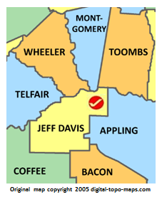 | current | ★ Approved revision 22:18, 1 January 2019 | 227 × 277 (37 KB) | Bethcottam (talk | contribs) | Map courtesy of [https://www.digital-topo-maps.com/county-map/georgia.shtml]. Copyright 2005.<br> Category:Georgia Maps Category:Jeff Davis County, Georgia |
