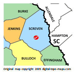 | current | ★ Approved revision 22:16, 6 January 2019 | 243 × 239 (28 KB) | Bethcottam (talk | contribs) | Map courtesy of [https://www.digital-topo-maps.com/county-map/georgia.shtml]. Copyright 2005.<br> Category:Georgia Maps Category:Screven County, Georgia |