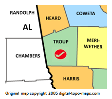| current | ★ Approved revision 13:13, 8 January 2019 | 230 × 203 (22 KB) | Bethcottam (talk | contribs) | Map courtesy of [https://www.digital-topo-maps.com/county-map/georgia.shtml]. Copyright 2005.<br> Category:Georgia Maps Category:Troup County, Georgia |