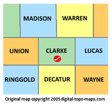 | current | ★ Approved revision 09:47, 7 May 2018 | 226 × 214 (17 KB) | Bethcottam (talk | contribs) | Map courtesy of [https://www.digital-topo-maps.com/county-map/iowa.shtmll]. Copyright 2005.<br> Category:Iowa Maps Category:Clarke County, Iowa |