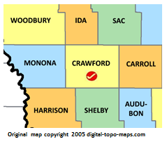 | current | ★ Approved revision 10:06, 7 May 2018 | 239 × 206 (19 KB) | Bethcottam (talk | contribs) | Map courtesy of [https://www.digital-topo-maps.com/county-map/iowa.shtmll]. Copyright 2005.<br> Category:Iowa Maps Category:Crawford County, Iowa |