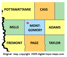| current | ★ Approved revision 19:58, 7 May 2018 | 217 × 187 (17 KB) | Bethcottam (talk | contribs) | Map courtesy of [https://www.digital-topo-maps.com/county-map/iowa.shtmll]. Copyright 2005.<br> Category:Iowa Maps Category:Montgomery County, Iowa |