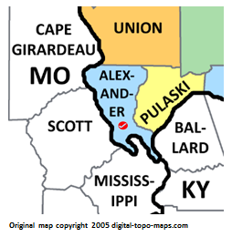 | current | ★ Approved revision 11:56, 1 June 2018 | 254 × 260 (33 KB) | Dotxinxoz (talk | contribs) | Map courtesy of [https://www.digital-topo-maps.com/county-map/illinois.shtml Digital-Topo-Maps.com]. Copyright 2005.<br> Category:Illinois Maps Category:Alexander County, Illinois |