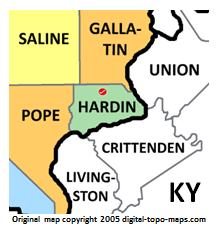| current | ★ Approved revision 12:25, 3 June 2018 | 220 × 232 (26 KB) | Dotxinxoz (talk | contribs) | Map courtesy of [https://www.digital-topo-maps.com/county-map/illinois.shtml Digital-Topo-Maps.com]. Copyright 2005.<br> Category:Illinois Maps Category:Hardin County, Illinois |