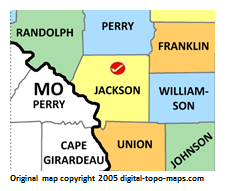 | current | ★ Approved revision 12:29, 3 June 2018 | 226 × 191 (25 KB) | Dotxinxoz (talk | contribs) | Map courtesy of [https://www.digital-topo-maps.com/county-map/illinois.shtml Digital-Topo-Maps.com]. Copyright 2005.<br> Category:Illinois Maps Category:Jackson County, Illinois |