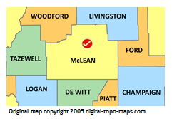 | current | ★ Approved revision 15:56, 5 June 2018 | 241 × 167 (18 KB) | Dotxinxoz (talk | contribs) | Map courtesy of [https://www.digital-topo-maps.com/county-map/illinois.shtml Digital-Topo-Maps.com]. Copyright 2005.<br> Category:Illinois Maps Category:McLean County, Illinois |