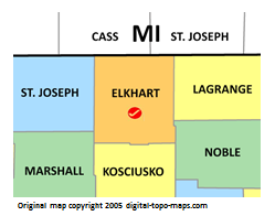| current | ★ Approved revision 19:33, 12 September 2018 | 249 × 196 (16 KB) | Bethcottam (talk | contribs) | Map courtesy of [https://www.digital-topo-maps.com/county-map/indiana.shtml]. Copyright 2005.<br> Category:Indiana Maps Category:Elkhart County, Indiana |