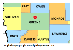 | current | ★ Approved revision 11:43, 13 September 2018 | 297 × 206 (24 KB) | Bethcottam (talk | contribs) | Map courtesy of [https://www.digital-topo-maps.com/county-map/indiana.shtml]. Copyright 2005.<br> Category:Indiana Maps Category:Greene County, Indiana |
