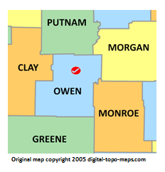 | current | ★ Approved revision 09:32, 18 September 2018 | 232 × 242 (18 KB) | Bethcottam (talk | contribs) | Map courtesy of [https://www.digital-topo-maps.com/county-map/indiana.shtml]. Copyright 2005.<br> Category:Indiana Maps Category:Owen County, Indiana |