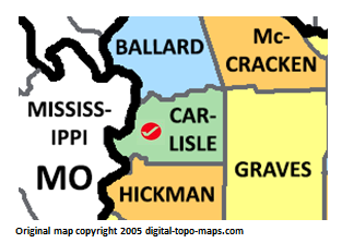 | current | ★ Approved revision 07:14, 6 June 2018 | 313 × 223 (37 KB) | Dotxinxoz (talk | contribs) | Map courtesy of [https://www.digital-topo-maps.com/county-map/kentucky.shtml Digital-Topo-Maps.com]. Copyright 2005.<br> Category:Kentucky Maps Category:Carlisle County, Kentucky |
