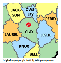| current | ★ Approved revision 08:02, 6 June 2018 | 252 × 257 (43 KB) | Dotxinxoz (talk | contribs) | Map courtesy of [https://www.digital-topo-maps.com/county-map/kentucky.shtml Digital-Topo-Maps.com]. Copyright 2005.<br> Category:Kentucky Maps Category:Clay County, Kentucky |