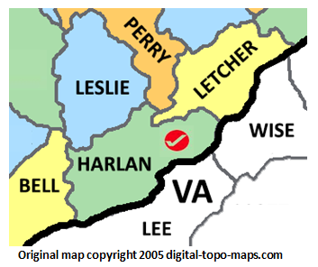 | current | ★ Approved revision 13:00, 7 June 2018 | 353 × 296 (53 KB) | Dotxinxoz (talk | contribs) | Map courtesy of [https://www.digital-topo-maps.com/county-map/kentucky.shtml Digital-Topo-Maps.com]. Copyright 2005.<br> Category:Kentucky Maps Category:Harlan County, Kentucky |
