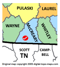 | current | ★ Approved revision 17:53, 7 June 2018 | 253 × 280 (45 KB) | Dotxinxoz (talk | contribs) | Map courtesy of [https://www.digital-topo-maps.com/county-map/kentucky.shtml Digital-Topo-Maps.com]. Copyright 2005.<br> Category:Kentucky Maps Category:McCreary County, Kentucky |