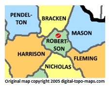 | current | ★ Approved revision 18:42, 7 June 2018 | 229 × 182 (28 KB) | Dotxinxoz (talk | contribs) | Map courtesy of [https://www.digital-topo-maps.com/county-map/kentucky.shtml Digital-Topo-Maps.com]. Copyright 2005.<br> Category:Kentucky Maps Category:Robertson County, Kentucky |