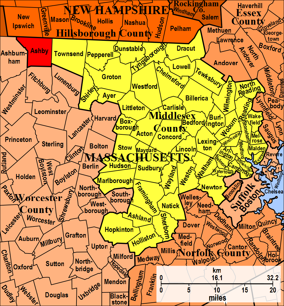 English: Town borders of Ashby, Middlesex, Massachusetts, USA, on a map of Middlesex County. |