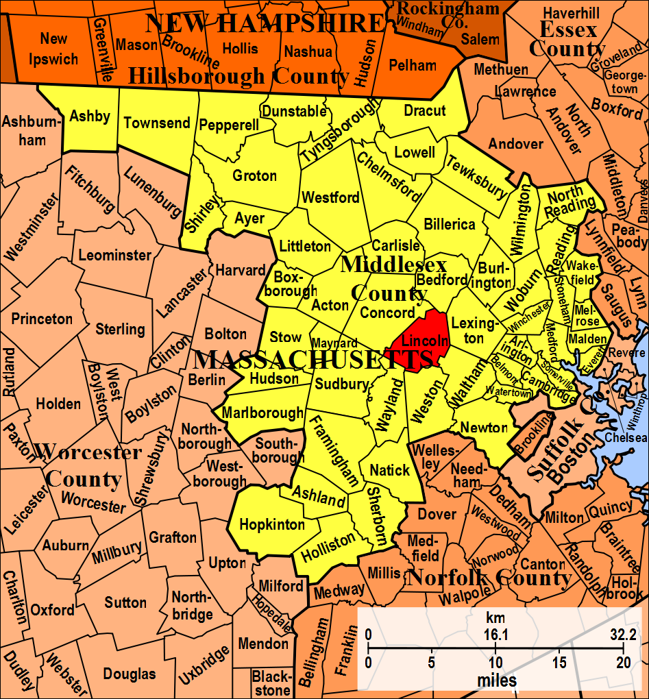English: Town borders of Lincoln, Middlesex, Massachusetts, USA, on a map of Middlesex County. |