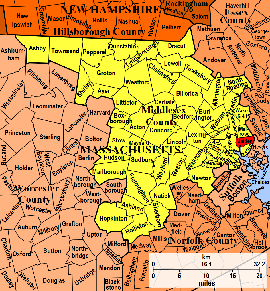 | current | ★ Approved revision 09:07, 24 November 2012 | 947 × 1,020 (485 KB) | DiltsGD (talk | contribs) | {{Information |Description='''English: ''' Town borders of Malden, Middlesex, Massachusetts, USA, on a map of Middlesex County. |Date=24 November 2012. |Source=Own work, based on original in Michael J. Leclerc, ''Genealogist's Handbook for New England Re |