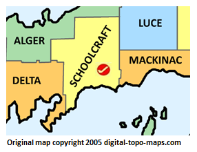 | current | ★ Approved revision 21:15, 25 October 2018 | 286 × 220 (31 KB) | Bethcottam (talk | contribs) | Map courtesy of [https://www.digital-topo-maps.com/county-map/michigan.shtml]. Copyright 2005.<br> Category:Michigan Maps Category:Schoolcraft County, Michigan |