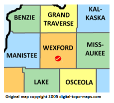 | current | ★ Approved revision 23:04, 26 October 2018 | 229 × 206 (24 KB) | Bethcottam (talk | contribs) | Map courtesy of [https://www.digital-topo-maps.com/county-map/michigan.shtml]. Copyright 2005.<br> Category:Michigan Maps Category:Wexford County, Michigan |