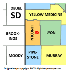 | current | ★ Approved revision 10:51, 3 November 2018 | 232 × 243 (22 KB) | Bethcottam (talk | contribs) | Map courtesy of [https://www.digital-topo-maps.com/county-map/minnesota.shtml]. Copyright 2005.<br> Category:Minnesota Maps Category:Lincoln County, Minnesota |