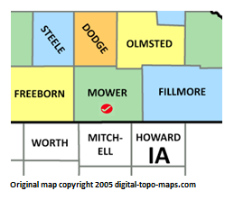 | current | ★ Approved revision 11:33, 5 November 2018 | 259 × 222 (20 KB) | Bethcottam (talk | contribs) | Map courtesy of [https://www.digital-topo-maps.com/county-map/minnesota.shtml]. Copyright 2005.<br> Category:Minnesota Maps Category:Mower County, Minnesota |