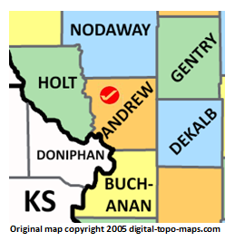 | current | ★ Approved revision 21:33, 19 November 2018 | 259 × 266 (38 KB) | Bethcottam (talk | contribs) | Map courtesy of [https://www.digital-topo-maps.com/county-map/missouri.shtml]. Copyright 2005.<br> Category:Missouri Maps Category:Andrew County, Missouri |