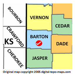 | current | ★ Approved revision 16:43, 20 November 2018 | 260 × 263 (32 KB) | Bethcottam (talk | contribs) | Map courtesy of [https://www.digital-topo-maps.com/county-map/missouri.shtml]. Copyright 2005.<br> Category:Missouri Maps Category:Barton County, Missouri |