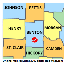 Thumbnail for version as of 17:13, 20 November 2018259 × 248 (33 KB)Bethcottam (talk | contribs)Map courtesy of [https://www.digital-topo-maps.com/county-map/missouri.shtml]. Copyright 2005.<br> Category:Missouri Maps Category:Benton County, Missouri