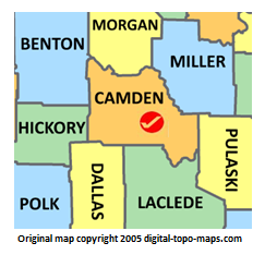 Thumbnail for version as of 16:31, 25 November 2018243 × 234 (32 KB)Bethcottam (talk | contribs)Map courtesy of [https://www.digital-topo-maps.com/county-map/missouri.shtml]. Copyright 2005.<br> Category:Missouri Maps Category:Camden County, Missouri