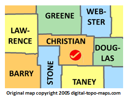 | current | ★ Approved revision 20:06, 26 November 2018 | 262 × 204 (29 KB) | Bethcottam (talk | contribs) | Map courtesy of [https://www.digital-topo-maps.com/county-map/missouri.shtml]. Copyright 2005.<br> Category:Missouri Maps Category:Christian County, Missouri |