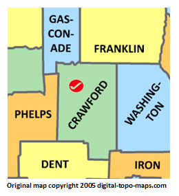 | current | ★ Approved revision 21:14, 26 November 2018 | 260 × 285 (33 KB) | Bethcottam (talk | contribs) | Map courtesy of [https://www.digital-topo-maps.com/county-map/missouri.shtml]. Copyright 2005.<br> Category:Missouri Maps Category:Crawford County, Missouri |