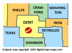 | current | ★ Approved revision 11:41, 27 November 2018 | 253 × 187 (24 KB) | Bethcottam (talk | contribs) | Map courtesy of [https://www.digital-topo-maps.com/county-map/missouri.shtml]. Copyright 2005.<br> Category:Missouri Maps Category:Dent County, Missouri |