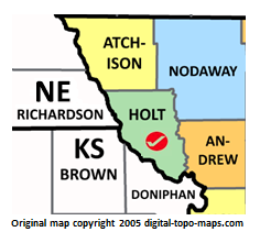 | current | ★ Approved revision 12:19, 28 November 2018 | 236 × 221 (29 KB) | Bethcottam (talk | contribs) | Map courtesy of [https://www.digital-topo-maps.com/county-map/missouri.shtml]. Copyright 2005.<br> Category:Missouri Maps Category:Holt County, Missouri |