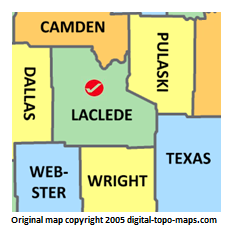 Thumbnail for version as of 09:21, 29 November 2018234 × 232 (26 KB)Bethcottam (talk | contribs)Map courtesy of [https://www.digital-topo-maps.com/county-map/missouri.shtml]. Copyright 2005.<br> Category:Missouri Maps Category:Laclede County, Missouri
