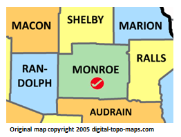 | current | ★ Approved revision 10:34, 30 November 2018 | 262 × 198 (28 KB) | Bethcottam (talk | contribs) | Map courtesy of [https://www.digital-topo-maps.com/county-map/missouri.shtml]. Copyright 2005.<br> Category:Missouri Maps Category:Monroe County, Missouri |