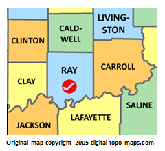 | current | ★ Approved revision 19:24, 30 November 2018 | 240 × 219 (29 KB) | Bethcottam (talk | contribs) | Map courtesy of [https://www.digital-topo-maps.com/county-map/missouri.shtml]. Copyright 2005.<br> Category:Missouri Maps Category:Ray County, Missouri |